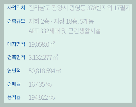 사업 위치: 전라남도 광양시 광영동 378번지외 17필지 건축 규모: 지하 2층 ~ 지상 18층, 5개 동 APT 332세대 및 근린생활 시설 대지 면적: 19,058.0㎡