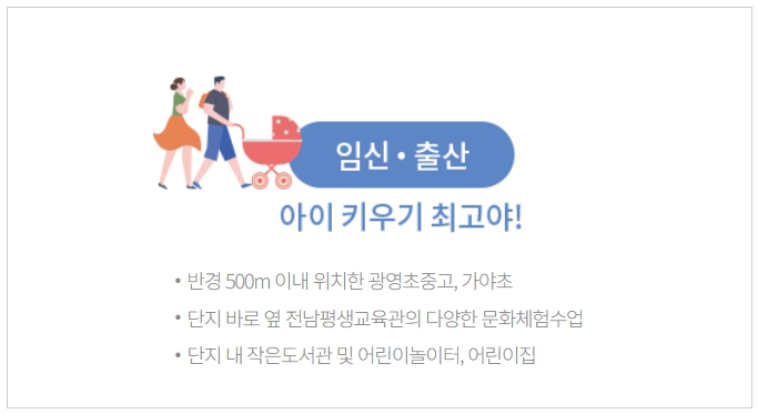 한라비발디 프리미어는 광양초, 중, 고와 가양초등학교가 도보 7분 거리에 위치하고 있어 교육 환경이 우수합니다. 또한 단지 바로 옆에 있는 전남 평생교육관에서는 다양한 문화체험 수업을 즐길 수 있으며, 가양산, 수어천, 광영근린공원, 의암 체육공원 등 근처의 자연환경은 힐링과 산책을 즐기기에 최적입니다.