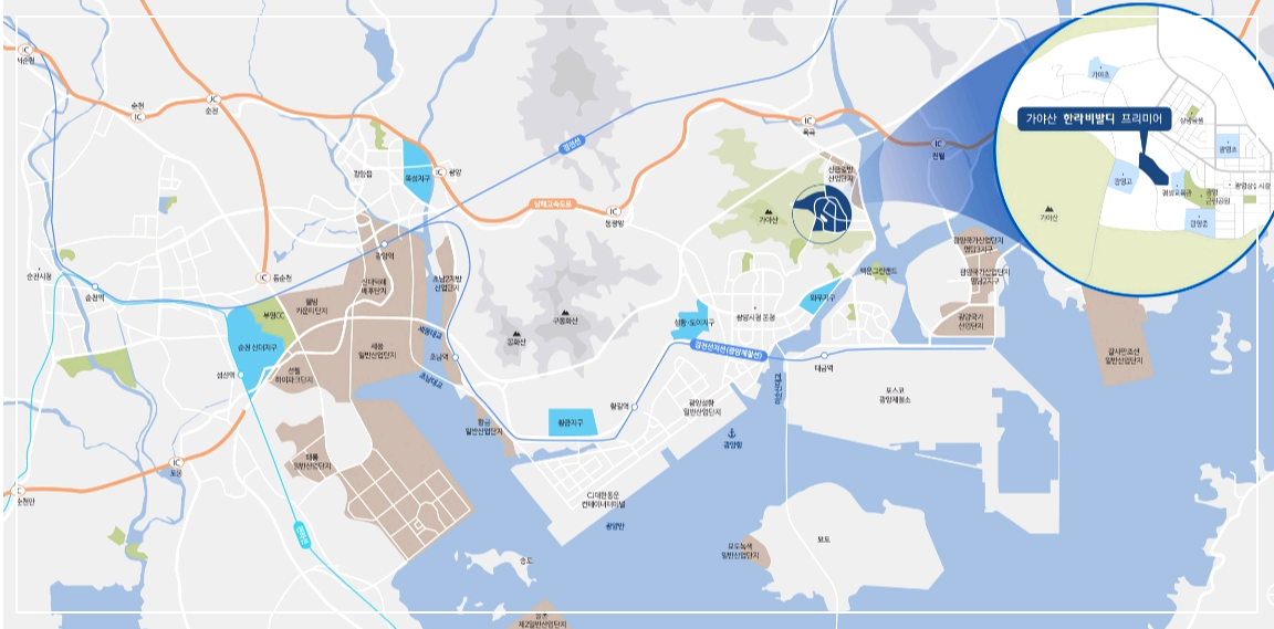 한라비발디 프리미어는 자연환경과 도시 생활의 조화로운 위치에 자리하고 있습니다. 가양산이 아름답게 내려다보이고, 동쪽에는 맑은 물이 흐르는 수어천과 배산임수의 청정 자연환경이 자랑스럽습니다. 남쪽으로는 금호대교를 건너면 포스코 광양 제철소가 있어 직주근접 혜택을 누릴 수 있습니다.