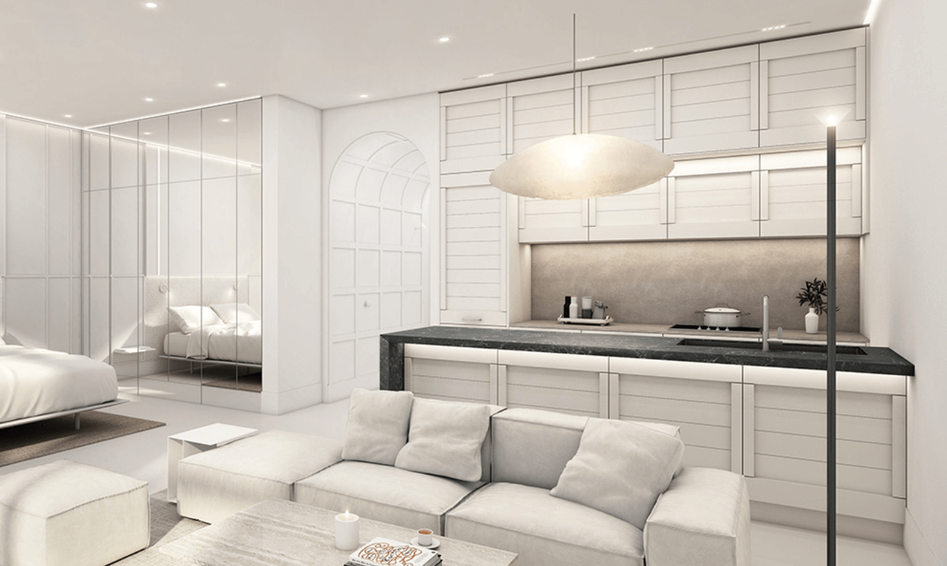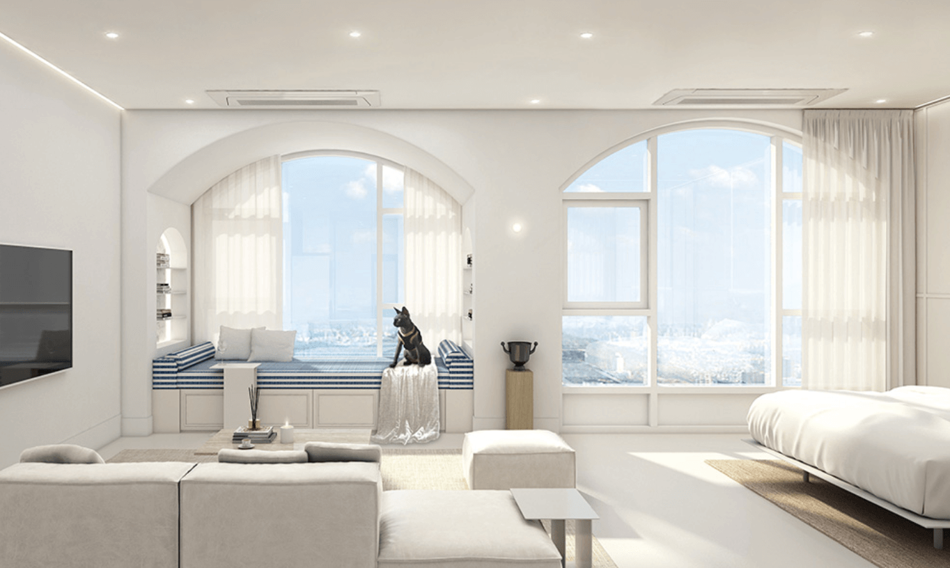 루카 831은 실내 설계에도 차별화를 꾀했습니다. 가장 눈에 띄는 부분은 2.9m의 높은 층고입니다. 이는 일반 아파트나 오피스텔보다 높은 수준으로, 펜트하우스에 준하는 개방감을 제공합니다. 또한 실내 디자인은 곡선과 직선을 조화롭게 결합한 아치형 인테리어를 도입해 우아하고 고급스러운 분위기를 자아냅니다. 대표 평형인 54㎡ 타입은 마스터룸과 거실·주방 공간을 유리벽(매직글라스 파티션)으로 분리해 공간 활용도를 극대화합니다. 주방은 11자형으로 설계되어 동선이 효율적이며, 대형 아일랜드 식탁을 배치해 식사와 업무를 동시에 해결할 수 있는 실용적인 구성을 자랑합니다.