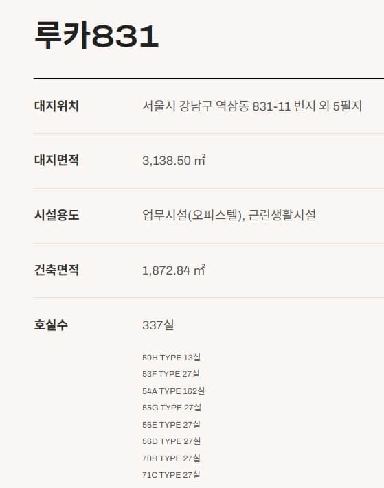 루카 831은 지하 7층지상 29층, 총 337실 규모로 구성되며, 서울 강남권에서 공급되는 오피스텔 중에서도 최대 규모급입니다. 전용면적은 50~71㎡(약 15~21평대)로, 기존 하이엔드 주거시설에서 보기 힘든 넓은 실내 공간을 제공합니다. 특히 모든 세대가 1.5~2룸 구조로 설계되어 원룸보다 뛰어난 공간 활용성과 프라이버시를 보장합니다.