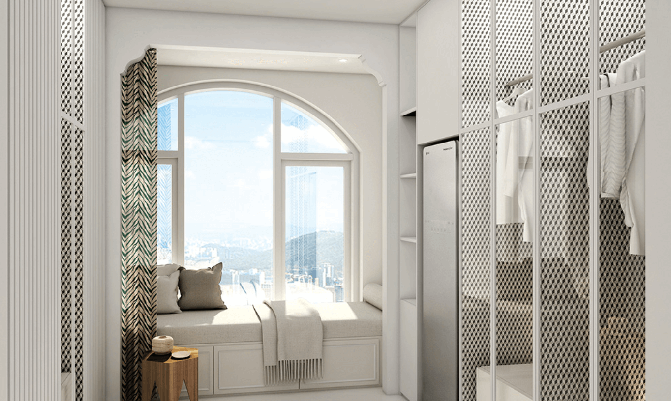 거실 창은 약 7.3m 광폭 창호 설계로 강남 도심을 한눈에 조망할 수 있으며, 창가에는 시그니처 퍼니처 윈도우시트를 무상으로 설치해 여유로운 휴식 공간을 제공합니다. 더불어 드레스룸에는 스타일러, 세탁기, 건조기를 함께 배치해 최소 동선으로 환복과 세탁을 해결할 수 있도록 효율적인 구조를 갖추고 있습니다.