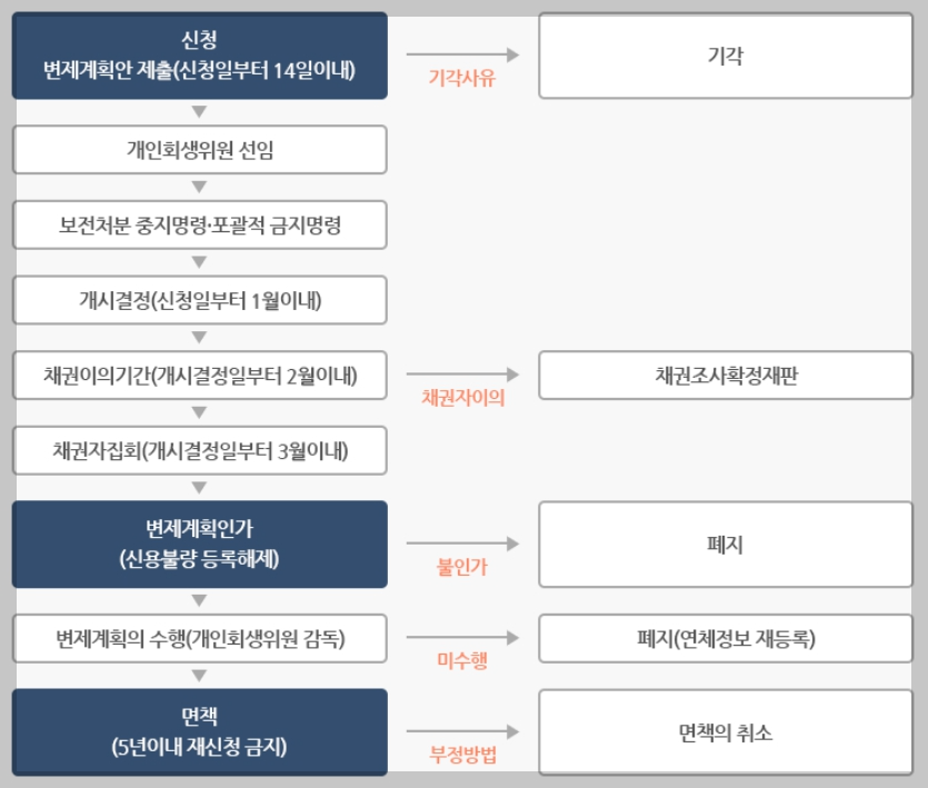 개인회생제도는 총채무액이 무담보채무의 경우에는 10억 원, 담도부채무의 경우에는 15억 원 이하인 개인채무자로서 장래 계속적으로 또는 반복하여 수입을 얻을 가능성이 있는 경우에 해당합니다. 개인회생을 위해선 일정기간 동안 일정한 금액을 변제하면 나머지 채무의 면제를 받을 수 있습니다. 단, 채무자 회생 및 파산에 관한 법률 제611조 제5항 단서의 경우 5년 동안 변제해야 합니다.