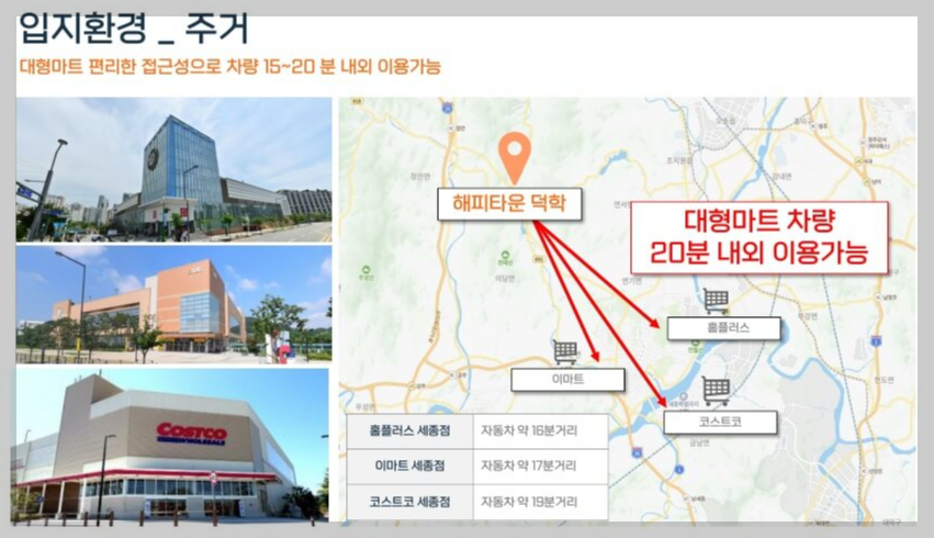 해피타운 덕학은 교통 편의성에서 큰 강점을 지니고 있습니다. 세종시 신도심과 가까워 차량으로 10분 이내에 주요 생활 인프라를 이용할 수 있습니다. 세종충남대학교병원, 대형마트, 골프장 등 편리한 생활환경을 누릴 수 있어 세종시 근교에서 전원생활을 원하는 분들께 매력적인 선택지가 될 것입니다.