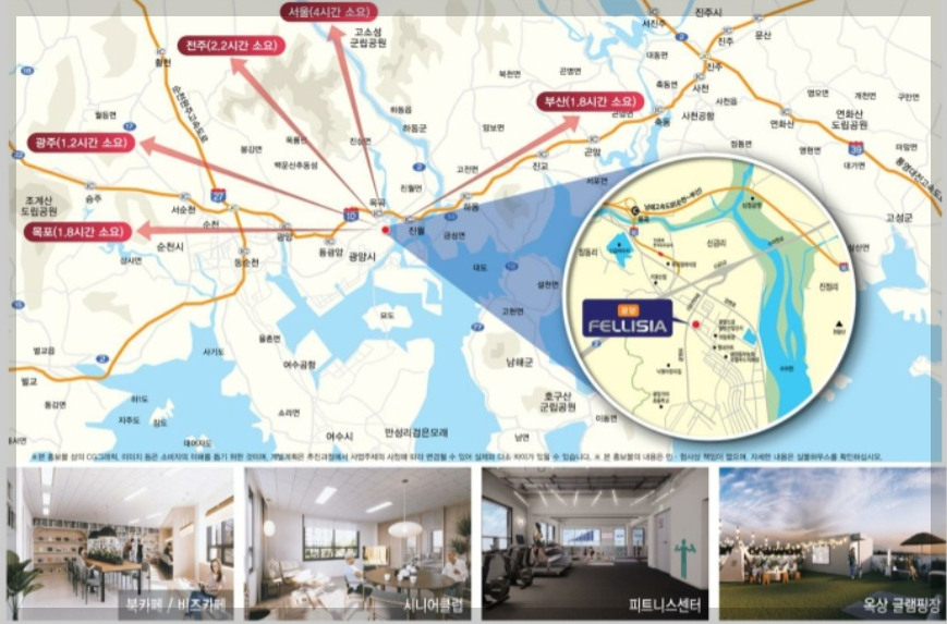 광양 펠리시아 아파트는 광주와 가까워서 광주 권역까지 15분 거리에 위치합니다. 또한 전주, 부산, 목포 등 대도시로 2시간 이내에 이동 가능합니다.