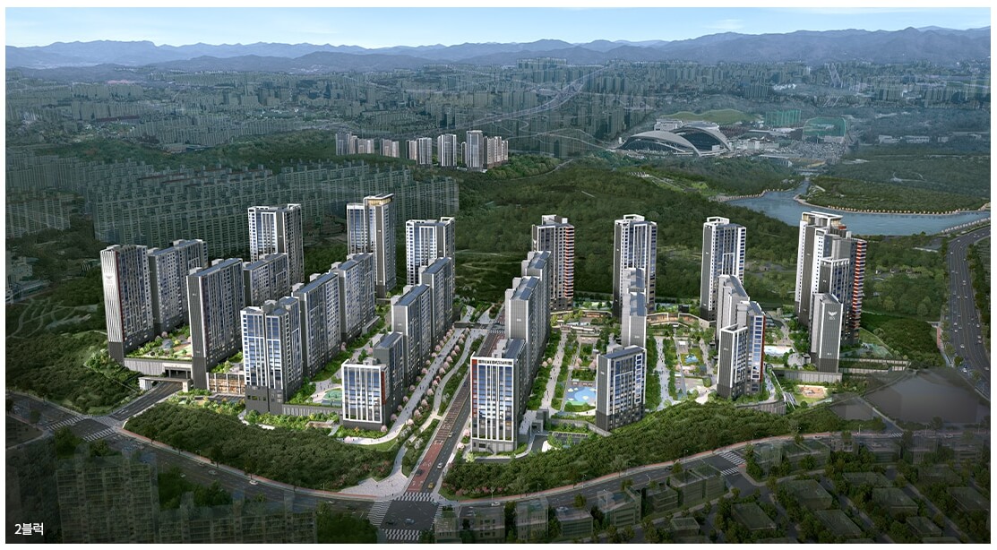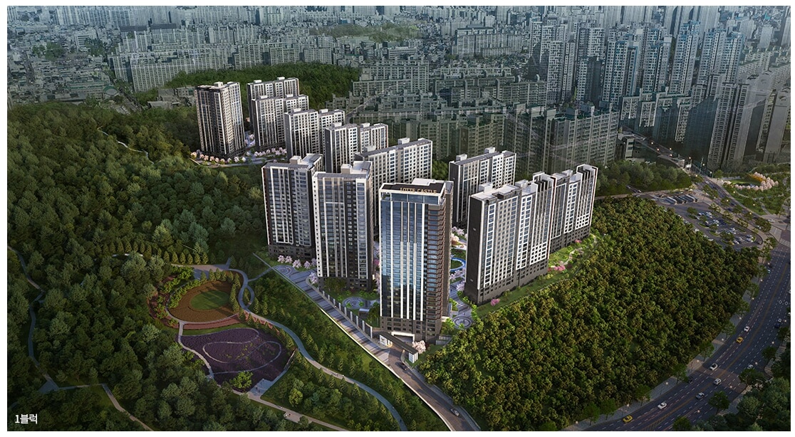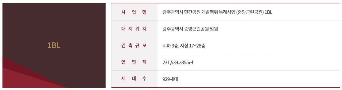1블록은 광주 서구 화정동 457-20번지 일원에 위치하며, 지하 3층에서 지상 28층까지 총 12개 동으로 구성되어 있습니다. 총 929세대로 이루어져 있으며, 주차대수는 1941대로 세대당 2.09대를 확보하여 광주에서는 보기 드문 넉넉한 주차 공간을 자랑합니다.