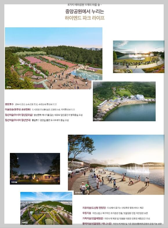 광주 롯데캐슬 시그니처는 중앙공원과 함께 조성되는 민간공원 특례사업지로, 약 224m² 규모의 공원을 포함합니다. 8가지 다양한 테마파크를 갖춘 공원으로 맑은 공기를 누릴 수 있는 자연환경을 제공합니다. 광주에서 유일하게 호수 공원을 단지 옆에 끼고 있어 차별화된 프리미엄 단지로 거듭날 것입니다.