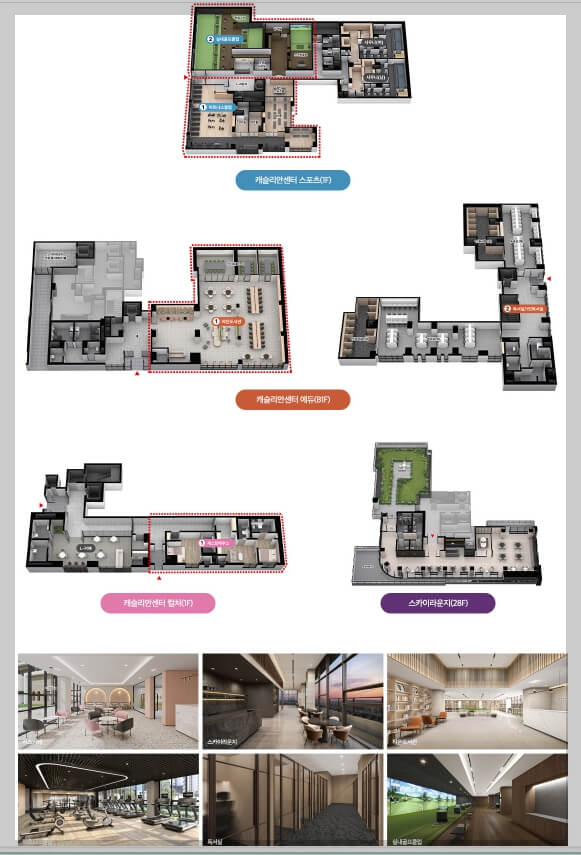 입주민을 위한 다양한 커뮤니티 시설도 마련되어 있습니다. 28층에는 스카이라운지가 조성되어 중앙공원 전망을 누릴 수 있으며, 사우나, 시니어클럽, 독서실, 북카페, 게스트룸, 피트니스, 골프클럽, 어린이집 등 다양한 시설이 계획되어 있습니다.
