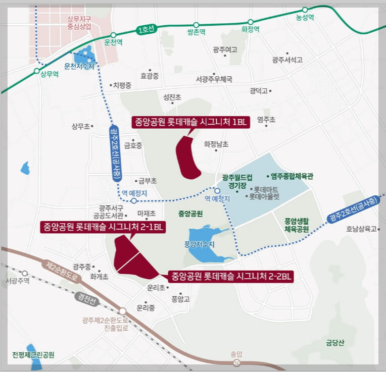 광주 롯데캐슬 시그니처는 교통 인프라도 우수한 편입니다. 제2순환도로를 통해 광주 전역 어디든 빠르고 편리하게 이동할 수 있으며, 호남고속도로를 통해 타 지역으로의 이동도 용이합니다. 또한, 단지 주변으로 광주 지하철 2호선 공사가 진행 중이어서 향후 높은 프리미엄이 기대됩니다.