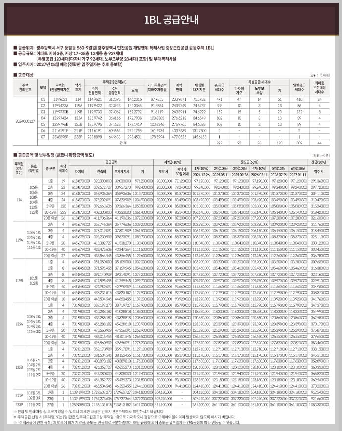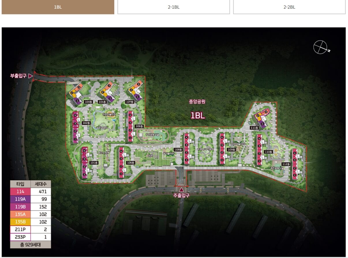 1BL: 929세대, 전용 114~233㎡