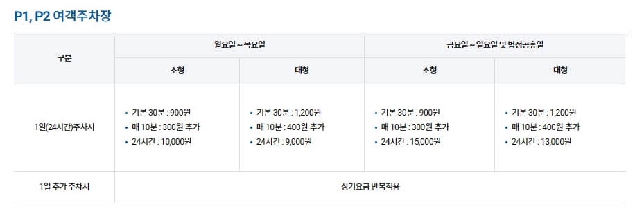 주차 요금은 주차 기간과 차량의 크기에 따라 다를 수 있습니다. 일일 주차 요금, 주간 주차 요금, 월별 요금 등 다양한 옵션이 제공되니 여행 계획에 맞게 선택하시면 됩니다.