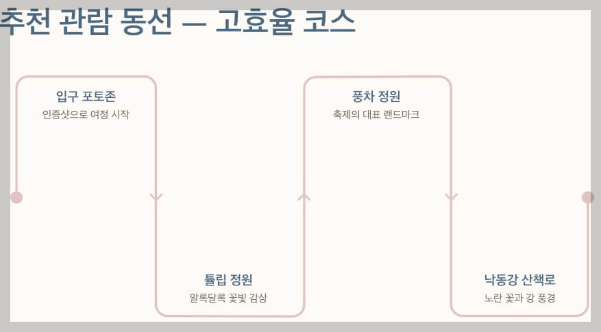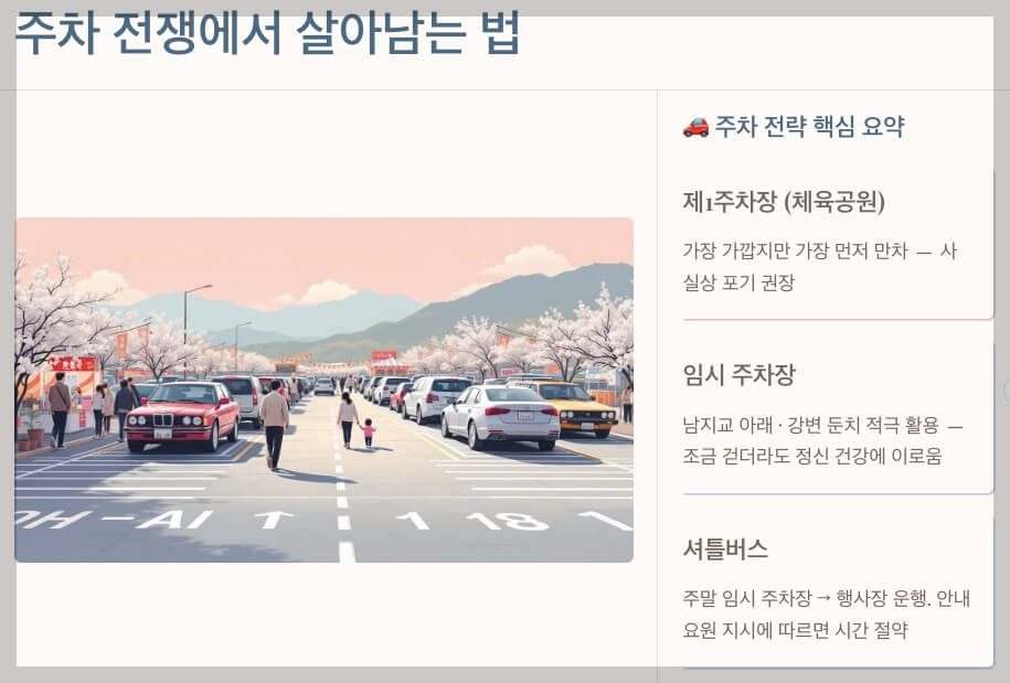 - 남지교 인근 임시 주차장: 메인 행사장과는 조금 거리가 있지만, 나갈 때 정체를 피하기 좋습니다.