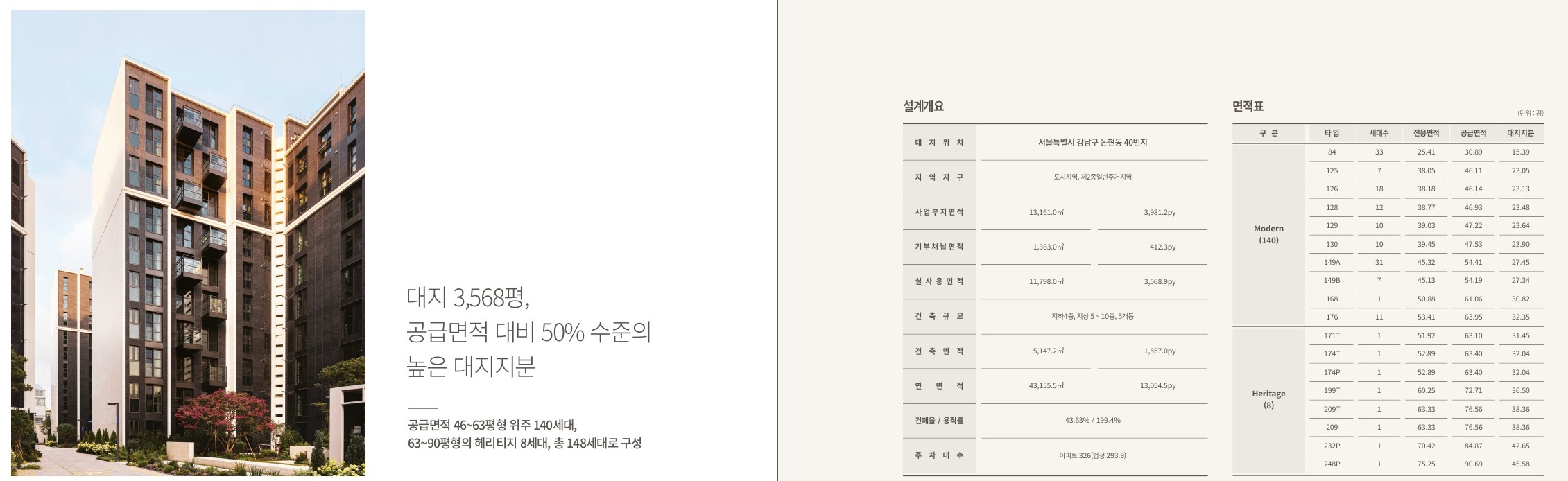 서울 강남구 논현동에 위치한 브라이튼 N40은 현대적이고 고급스러운 주거 단지로, 지하 4층과 지상 5~10층으로 이루어진 5개동으로 구성되어 있습니다. 이 아름다운 아파트 단지는 전용 면적 84176㎡의 모던하우스 140가구와 전용 면적 171~248㎡의 헤리티지 펜트하우스 8가구 등 총 148가구로 구성되어 있습니다. 이번 분양에서는 전용 면적 84㎡인 8가구, 126㎡인 19가구, 그리고 176㎡인 2가구의 총 29가구가 분양될 예정입니다.