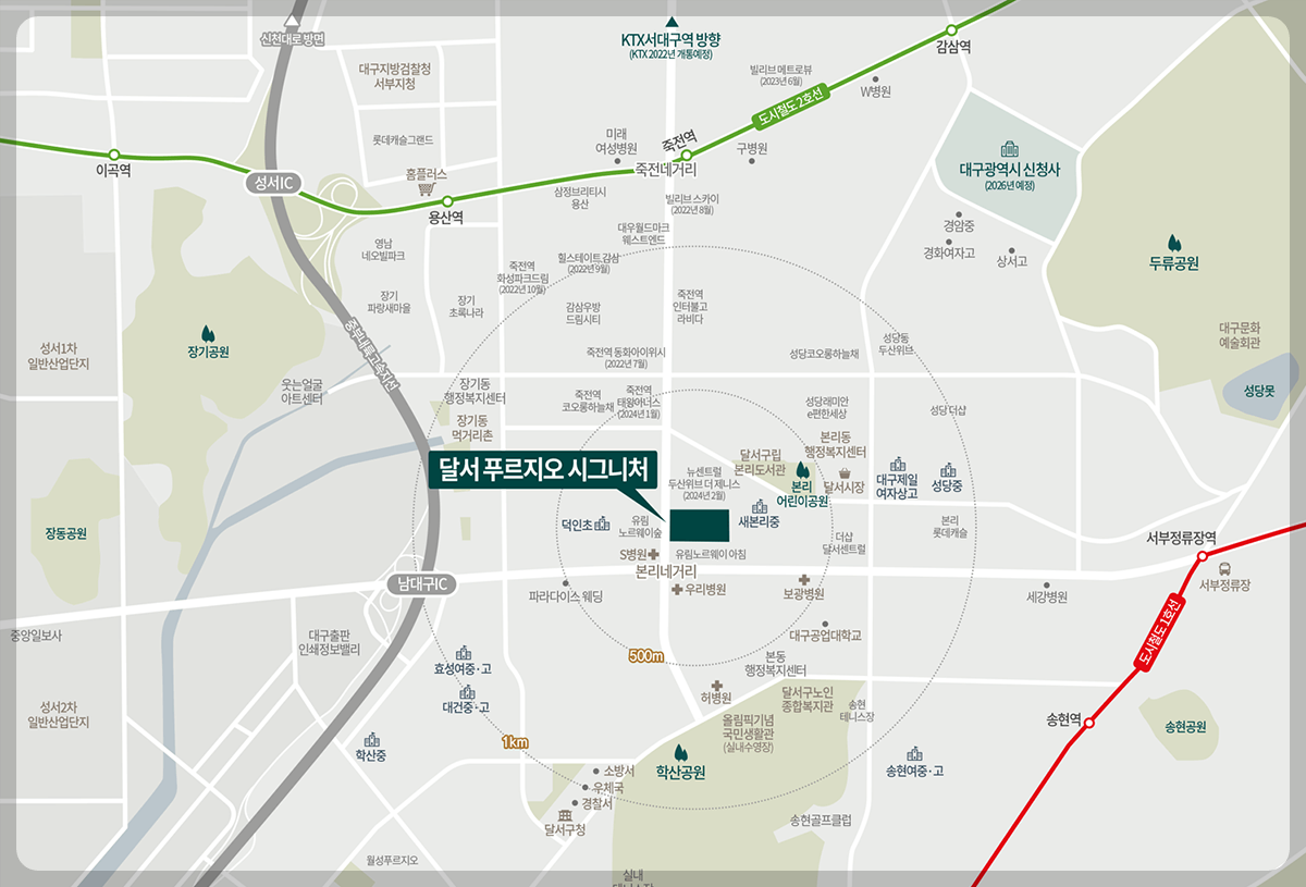 달서 푸르지오 시그니처는 교통 편의성을 자랑합니다. 대구도시철도 2호선 죽전역과 1호선 서부정류장역은 약 5분 거리에 있어 대중교통을 편리하게 이용할 수 있습니다. 또한 KTX 서대구역까지의 접근도 용이하며, 달구벌대로와 와룡로가 인접해 대구 전역으로의 이동이 편리합니다. 또한 버스정류장도 도보 거리에 위치해 시내 및 외부 이동이 편리합니다.