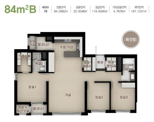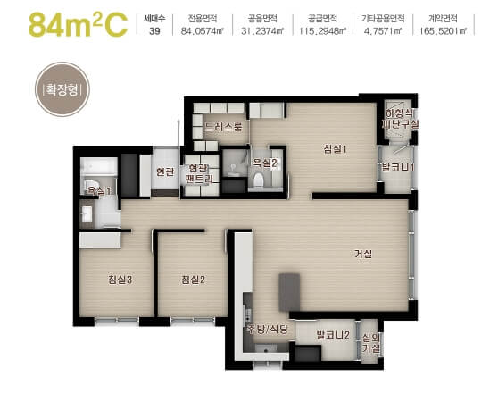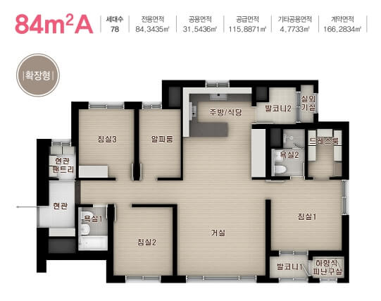 - 84A 타입: 3Bay 4 Room 구조, 알파룸 포함 최대 4개의 방으로 활용 가능. 드레스룸은 디귿(ㄷ)자 형태로 수납 효율이 높으며, 현관 팬트리 공간이 넉넉해 계절용품 보관 용이.
