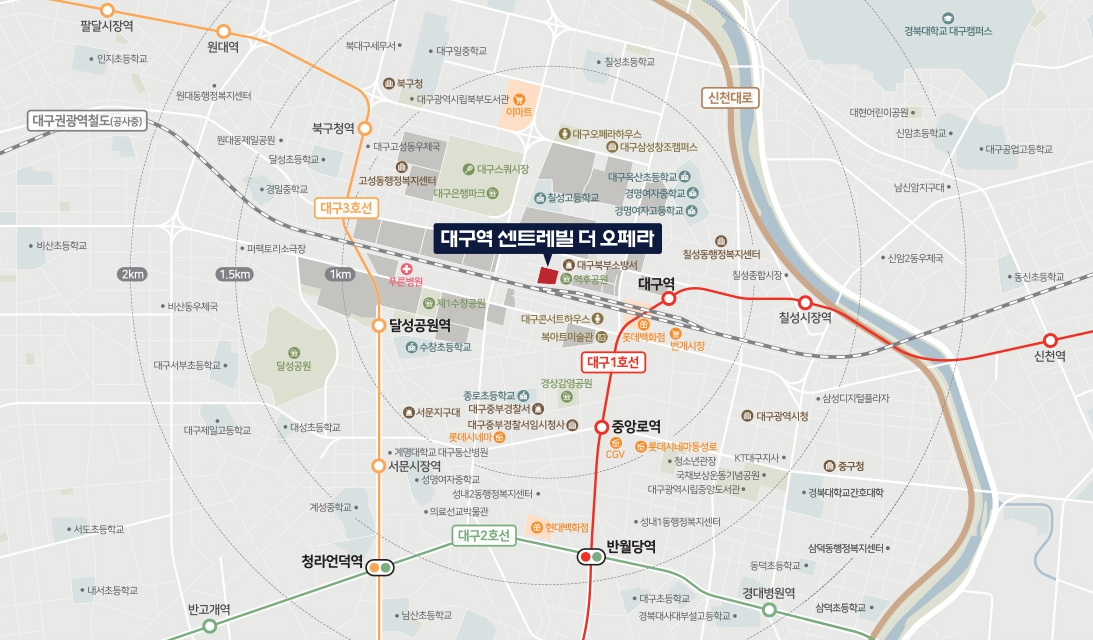 - 교통 편의: 대구역 도보 이동, 3호선 환승 가능, 신천대로와 고속도로 진출입 용이.