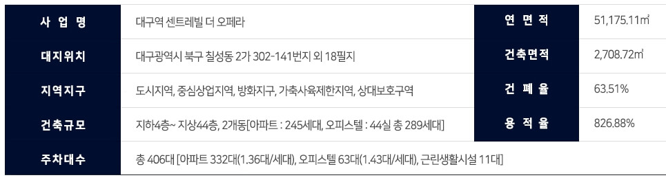 대구역 센트레빌 더 오페라는 지하 4층~지상 44층 2개 동으로 설계되었으며, 아파트 전용 84㎡A~D 타입 총 245세대와 오피스텔 전용 84㎡ 44실로 구성됩니다.