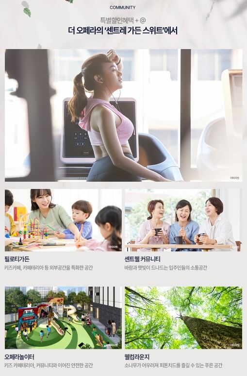 공용 공간에는 액티브 가든, 센트레가든 스위트, 오페라 놀이터 등 다양한 커뮤니티 시설이 조성되어 있으며, 카페테리아, 키즈카페, 헬스클럽 등 실거주 만족도를 높이는 시설도 갖추었습니다. 지상과 오피스텔, 상가 진입로를 분리하여 안전성과 편리성을 확보한 점도 특징입니다.