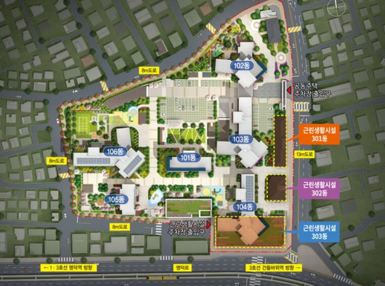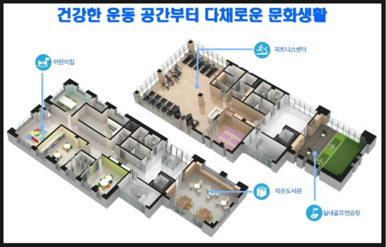 주거 단지 내에는 피트니스센터, 실내골프연습장, 어린이집, 작은 도서관, 경로당 등의 다양한 시설이 마련되어 있습니다. 또한, 넓은 중앙광장과 조경이 아름다운 놀이터들은 주민들에게 안락하고 즐거운 생활을 제공합니다.