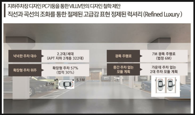 지하주차장 디자인 PC 기둥을 통한 VILLIV만의 디자인 철학제안 직선고 곡선의 조화를 통해 절제된 고급감 표현 정제된 럭셔리 더불어 컨시어지 서비스도 제공되어 거주자들의 편의를 도모합니다. 하우스키퍼, 세차, 세탁 서비스뿐만 아니라 스마트폰과 연동한 리빙 & 라이프 서비스도 제공될 예정입니다.