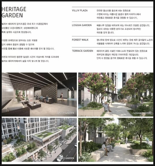 빌리브 헤리티지는 주거공간뿐만 아니라 주변환경까지 고려하여 조성됩니다. 협업 파트너인 삼성물산 에버스케이프와 함께 조경시설을 개선하여 입주민들의 힐링 스폿으로 조성될 것입니다.