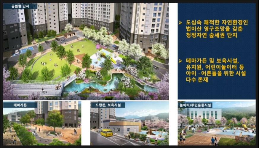 이 아파트는 자연환경과 가까운 위치에 자리하고 있습니다. 앞산과 법이산이 서쪽과 동쪽에 위치해 있으며, 신천이 흐르고 수성못과 가장호가 인근에 자리하고 있습니다. 또한, 입주민들의 편의를 위해 피트니스센터, 실내골프연습장, 시니어센터, 북카페 등의 편의시설을 갖추고 있습니다.