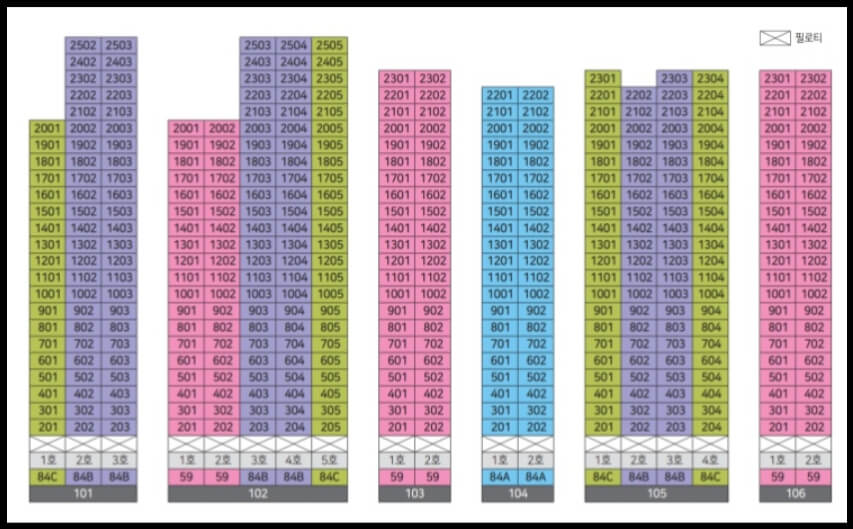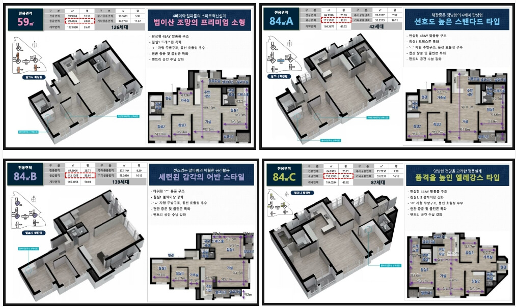 이 아파트는 59㎡부터 84㎡까지 다양한 사이즈와 형태의 단위로 구성되어 있습니다. 각 타입은 가족실을 포함한 다양한 옵션을 통해 팬트리 등의 공간을 활용할 수 있도록 설계되었습니다. 특히, 59㎡ 타입은 채광, 일조, 조망 및 환기 등을 고려한 4 Bay 알파공간으로 구성되어 있어 탁월한 주거 환경을 제공합니다.