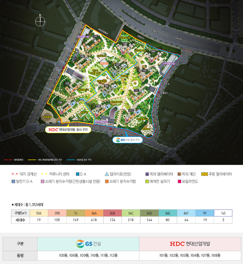 59A(19세대), 59B(105세대), 76(149세대), 84A(418세대) 84B(134세대), 84C(218세대), 84D(144세대), 84E(80세대), 84F(64세대), 99(19세대), 145(3세대) 총 1,353세대