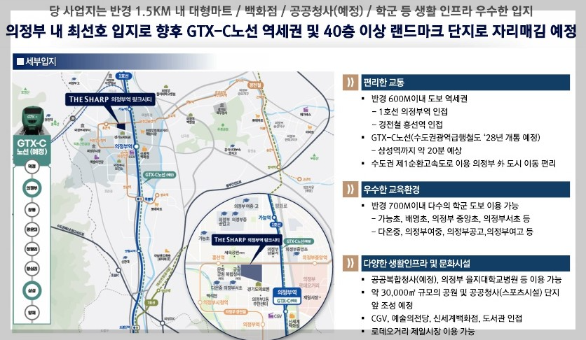 당사업지 반경 1.5km 내 대형마트/백화정/공공청사(예정)/학군 등 생활 인프라 우수한 입지 의정부 내 최선호 입지로 향후 GTX-C노선 역세권 및 40층 이상 랜드마크 단지로 자리매김 예정 편리한 교통