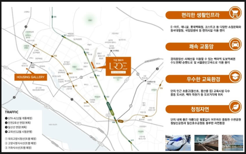 자연환경 측면에서도 정발산 공원, 일산 호수공원과 같은 녹지 공간이 풍부해 쾌적한 주거 생활이 가능합니다. 특히, 풍동천 수변공원과 벚꽃길이 단지 내에 있어 자연 속에서 여유로운 시간을 보낼 수 있습니다.