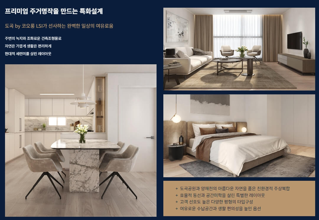 '도곡 by 코오롱 LSI'는 강남의 핵심 지역인 도곡동에서 미래 가치를 지닌 주거지로서, 뛰어난 교육 시설, 다채로운 편의 시설, 자연과 어우러진 풍경, 우수한 교통 인프라, 스마트 홈시스템, 규제의 완화 등의 장점을 갖추고 있습니다. 또한 강남의 도심 속에서도 자연을 누릴 수 있는 녹지와 함께, 편리한 인프라와 현대적인 설계로 더 나은 삶을 시작할 수 있습니다. 강남에서 새로운 삶의 가치를 찾고자 하는 분들에게 완벽한 선택이 될 것입니다