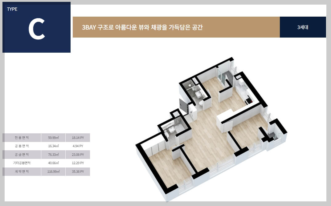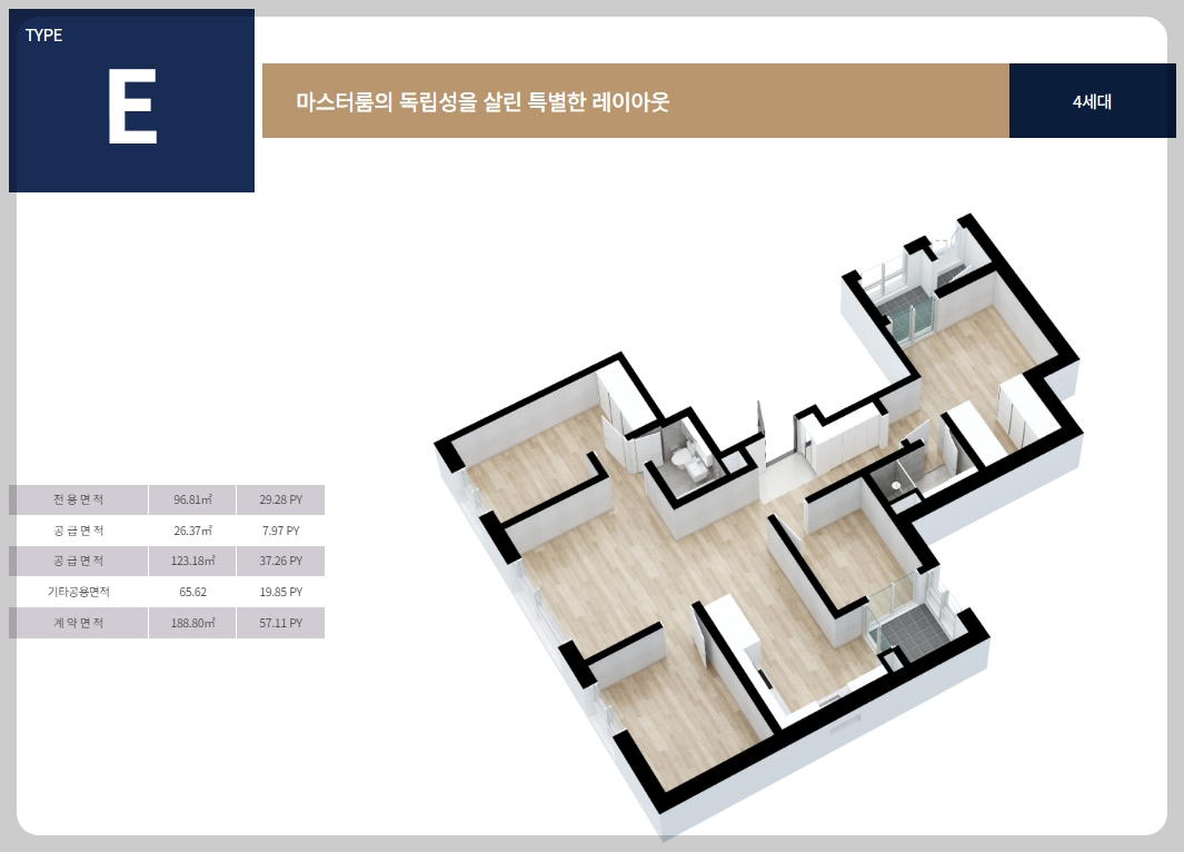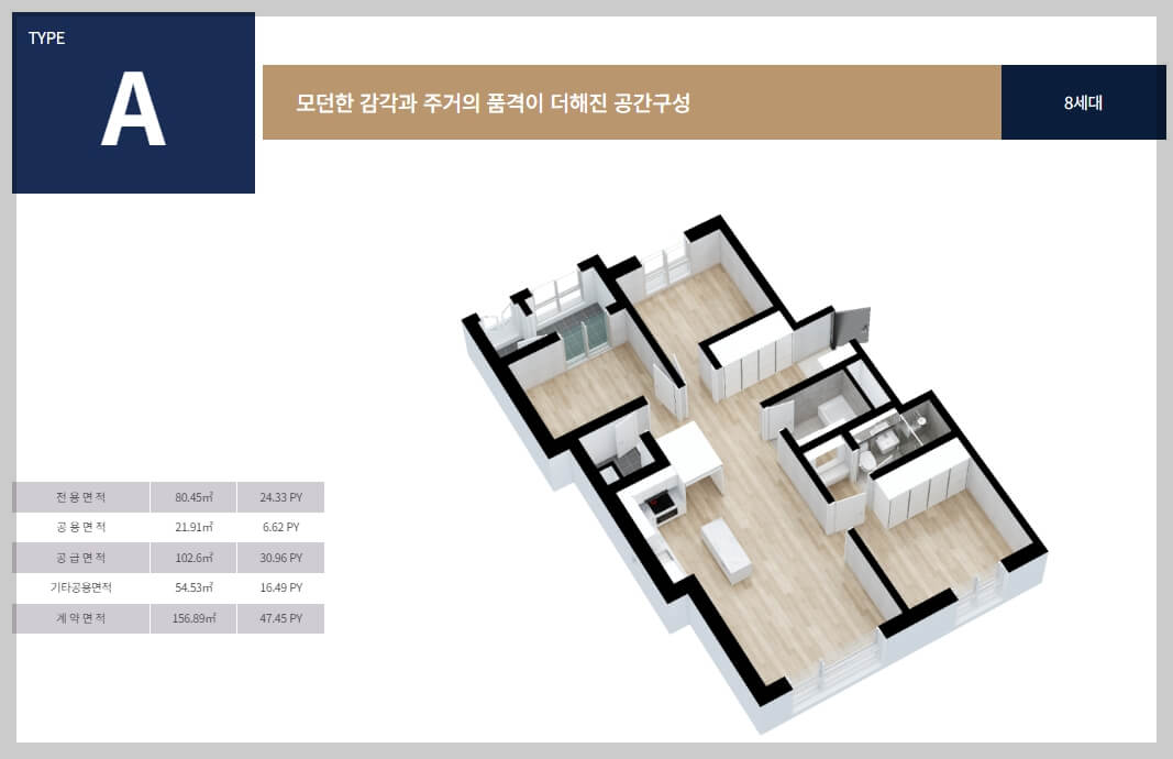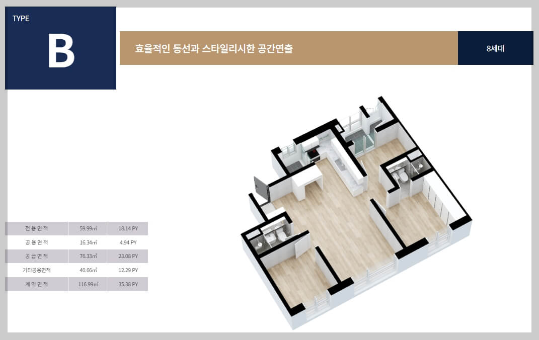 '도곡 by 코오롱 LSI'는 총 8개의 다양한 타입의 아파트로 구성되어 있습니다. 각 타입은 효율적인 동선과 세련된 공간 설계를 특징으로 하며, 생활 편의성을 높이기 위한 여유로운 수납공간을 제공합니다.