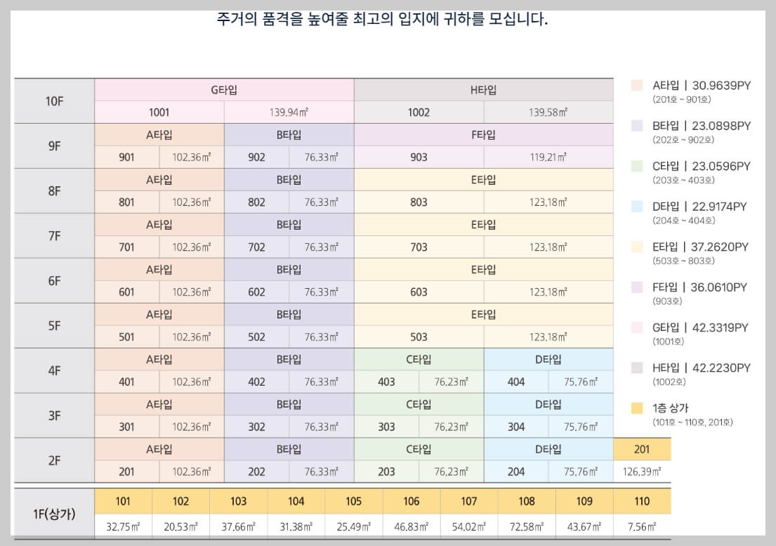 좋은 입지와 다채로운 선택, 풍요로운 주거 미래를 약속하는 도곡 by 코오롱 LSI’는 서울시 강남구 도곡동 인근에 지하 2층~지상 10층, 1개 동, 총 29세대 규모로 조성되는 프리미엄 주상복합 아파트입니다. 기존 강남 아파트 대비 합리적인 분양가를 책정됐으며, 별도의 청약통장 없이 선착순으로 동과 호수 지정계약이 가능해 내 집 마련 기회를 높였습니다. 또한 청약통장이 필요 없고 분양권 전매제한이 없는 30세대 미만 아파트로, 계약금만 지불하면 중도금 대출 없이도 입주가 가능합니다. 이러한 유리한 조건과 미래 가치 상승에 의해 수요자와 투자자들로부터 큰 관심을 받고 있습니다. 단지는 다양한 타입을 구성해 소비자의 선택 폭을 넓혔다. 총 8개의 타입으로 조성되며, 타입별 세대수는 80㎡A (8세대), 60㎡B (8세대), 60㎡C (3세대), 97㎡E(4세대) 등으로 구성된다.