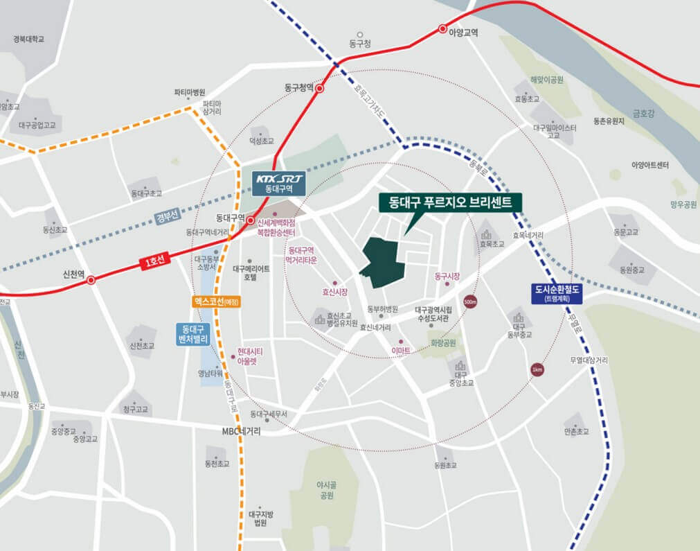 동대구 푸르지오 브리센트는 교통 접근성에서도 높은 점수를 받습니다. 동대구역이 도보 15분 거리에 있어 KTX, SRT, 고속버스를 편리하게 이용할 수 있습니다. 1호선 지하철, 화랑로와 동부로를 통한 차량 이동도 수월하며, 향후 트램과 도시철도 순환망까지 구축되면 더욱 촘촘한 교통망이 완성될 예정입니다.