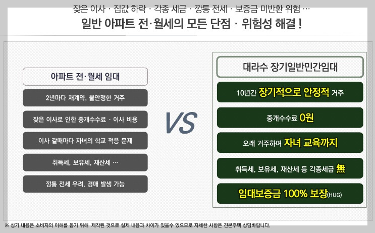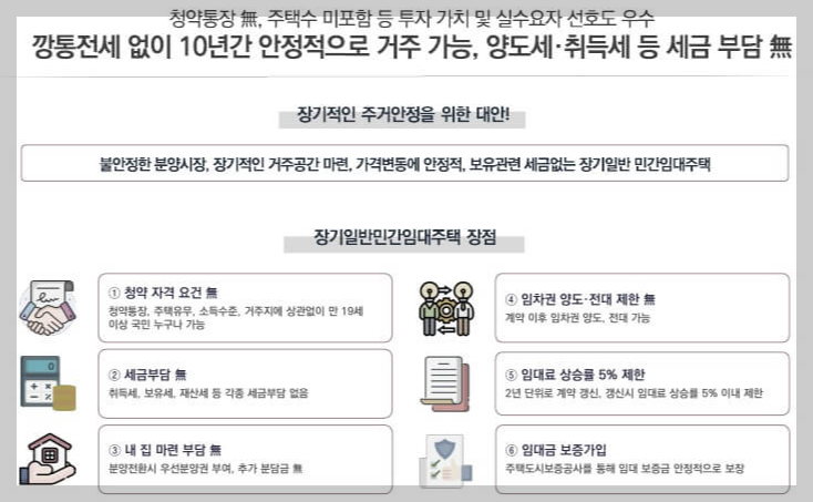 - 불안정한 분양시장, 장기적인 거주공간 마련, 기격변동에 안정적, 보유관련 세금 없이 장기일반 민간임대주택