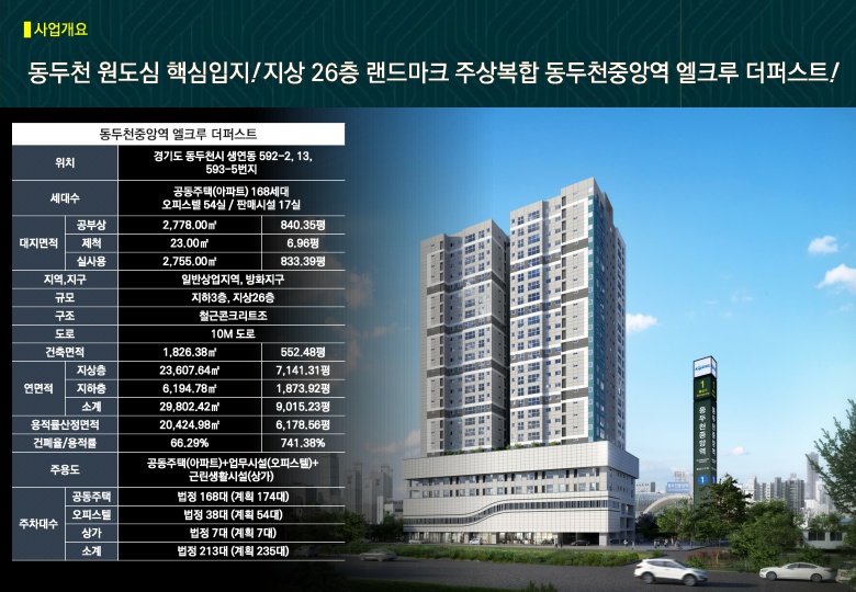 동두천 중앙역 엘크루 더퍼스트는 경기도 동두천시 생연동에 위치한 아파트와 오피스텔로 이루어진 주상복합입니다. 이곳은 교통, 교육, 생활 시설과 함께 미래 가치를 고려한 중요한 입지에 자리하고 있습니다. 아파트 168세대, 오피스텔 54실, 판매시설 17실로 구성되어 있으며, 지하 3층부터 지상 26층까지 다양한 시설을 제공합니다. 전용면적 72㎡평형대만 100%구성되어 있으며 전 세대 4 Bay 설계로 채광 및 통풍, 생활 편의시설을 누릴 수 있습니다.