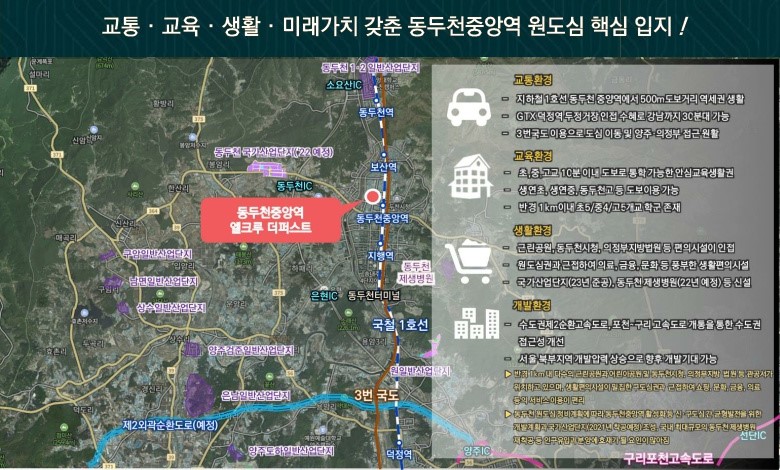 지하철 1호선 동두천 중앙역 도보 500m 이내, 역세권 생활 편의 GTX 덕정역까지 두 정거장 거리로 강남까지 30분 이내 이동 가능 3번 국도를 이용하여 도심 및 양주, 의정부 접근이 용이