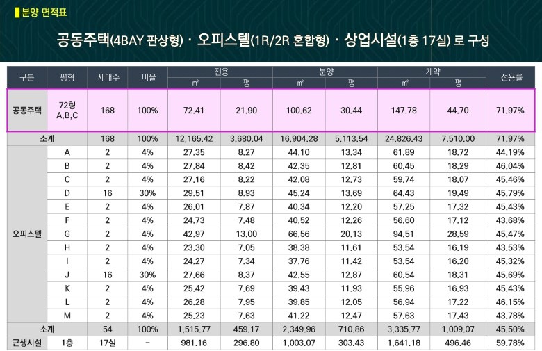 세대수:공동주택(아파트) 168세대/오피스텔 54실/판매시설 17실