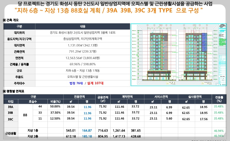 동탄역 헤미쉬 오피스텔은 지하 6층에서 지상 13층까지 1개동으로 구성되어 있으며, 총 88호실로 이루어져 있습니다. 세 가지 주택형 별로 구성되어 있으며, 내부는 광폭 드레스룸과 붙박이장을 비롯한 다양한 시설을 갖추고 있습니다. 빌트인 풀옵션(세탁기, 건조기, 냉장고, 인덕션, 후드, 드레스룸 수납장 등)과 주민편의시설, 하늘정원도 조성될 예정이며, 비상발전기 시설과 소방관리 안전시스템 등의 고급 보안 시설도 갖추게 됩니다.