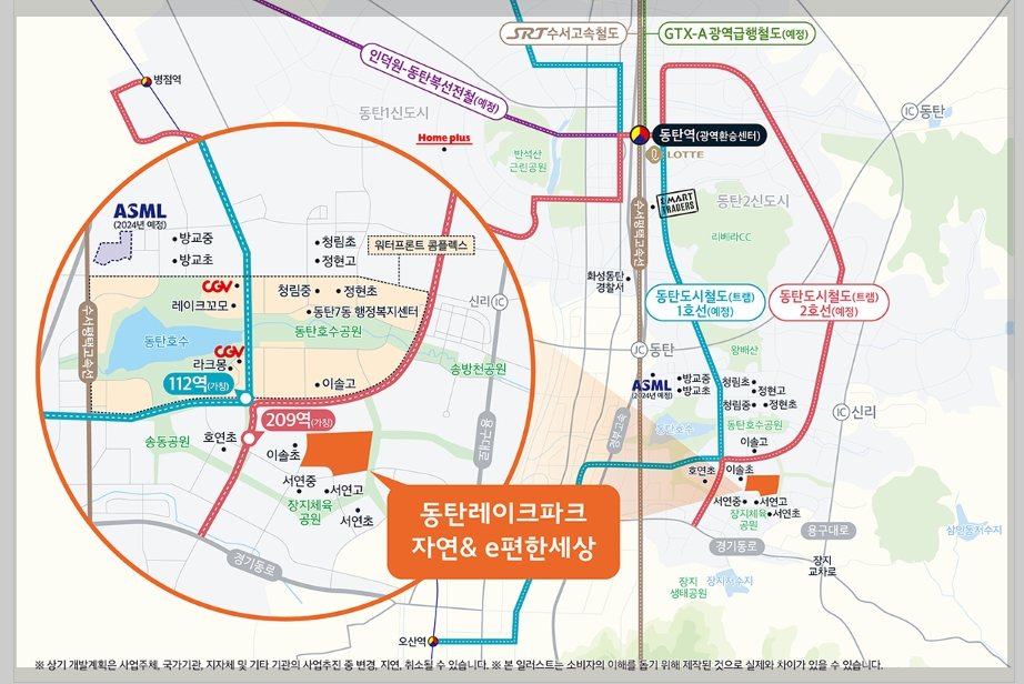 동탄 레이크파크 자연&e편한세상은 동탄 2 신도시 아래쪽에 위치해 있습니다. 동탄 2 신도시는 거의 완성 단계로 분양은 신동호수 쪽을 제외하고 아래쪽이 거의 마지막일 것으로 예상됩니다. 동탄은 동탄역을 중심으로 SRT수서고속철도와 GTX-A가 2024년 개통 예정으로 서울 및 수도권 접근성이 높아질 전망이며, 동탄신도시 자체의 교통망 활성화를 위해 동탄도시철도를 만들 예정입니다. 이는 트램으로서 동탄역 접근 편의성을 높이고 오산역까지 이어야 하므로 향후 상당한 역할을 할 것으로 예상됩니다.