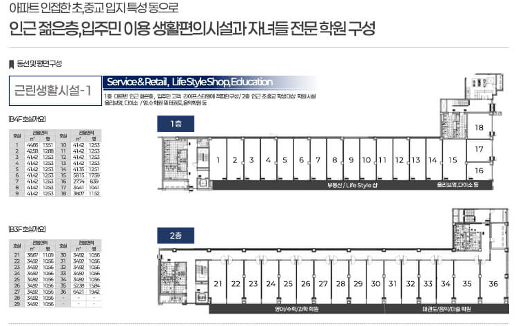 • 2동 : 약국, 내과·치과 등 메디컬 업종과 뷰티·학원 시설