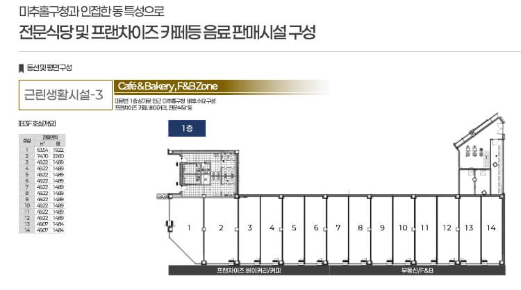 • 1동 : 프랜차이즈 커피, 베이커리, 편의점, 부동산 등 생활 밀착형 업종