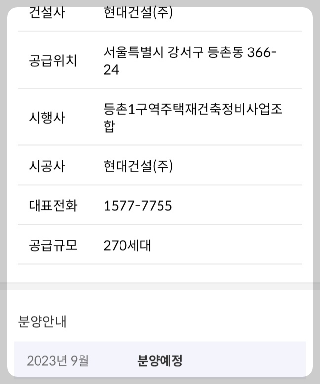 이 프로젝트는 현대건설(주)이 건설을 담당하며, 서울특별시 강서구 등촌동 36-24 지역에서 공급될 예정입니다. 시행사로는 등촌 1구역 주택 재건축정비사업조합이 참여하며, 시공사 또한 현대건설(주)이 맡고 있습니다. 이 주거단지는 총 517세대 중 270세대가 공급되며, 최고 15층의 건물로 구성될 예정입니다. 용적률은 196%, 건폐율은 30%로 조화로운 주거환경을 구성할 계획입니다. 분양은 2023년 9월에 시작될 예정입니다.