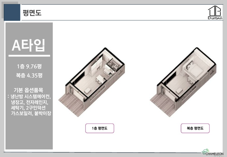 A타입은 1층 9.76평과 복층 4.35평으로 구성된 구조입니다. 냉난방 시스템에어컨, 냉장고, 전자레인지, 세탁기, 2구 인덕션, 가스보일러, 붙박이장.