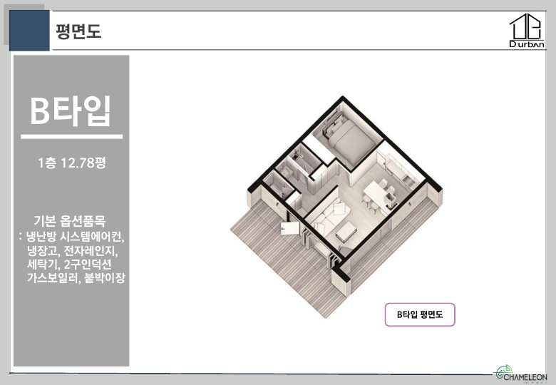 B티 입은 1층 12.78평으로 구성되어 있으며, 냉난방 시스템에어컨, 냉장고, 전자레인지, 세탁기, 2구 인덕션, 가스보일러, 붙박이장.