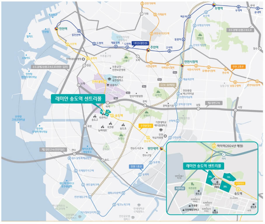 래미안 송도역 센트리폴은 우수한 교통 인프라를 자랑한다. 수인분당선을 이용할 수 있는 송도역이 도보로 접근 가능한 역세권에 위치해 있다. 더불어 인천부산을 잇는 인천발 KTX(예정), 송도강릉 경강선(예정), 월곶~판교선(예정) 등의 개통으로 새로운 교통 중심지로 거듭날 전망이다. 또한 신도시급 주거 인프라가 조성되며 상업·문화·업무 시설도 구비됩니다.