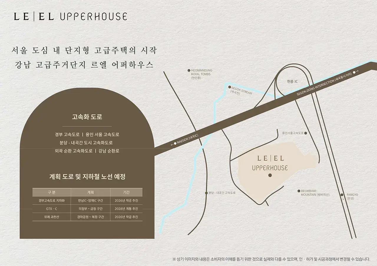 주변에는 고속화 도로와 분당-내곡간 도시 고속화도로, 외곽 순환 고속화도로, 강남 순환로, 계획도로 및 지하철 노선이 예정되어 있습니다.