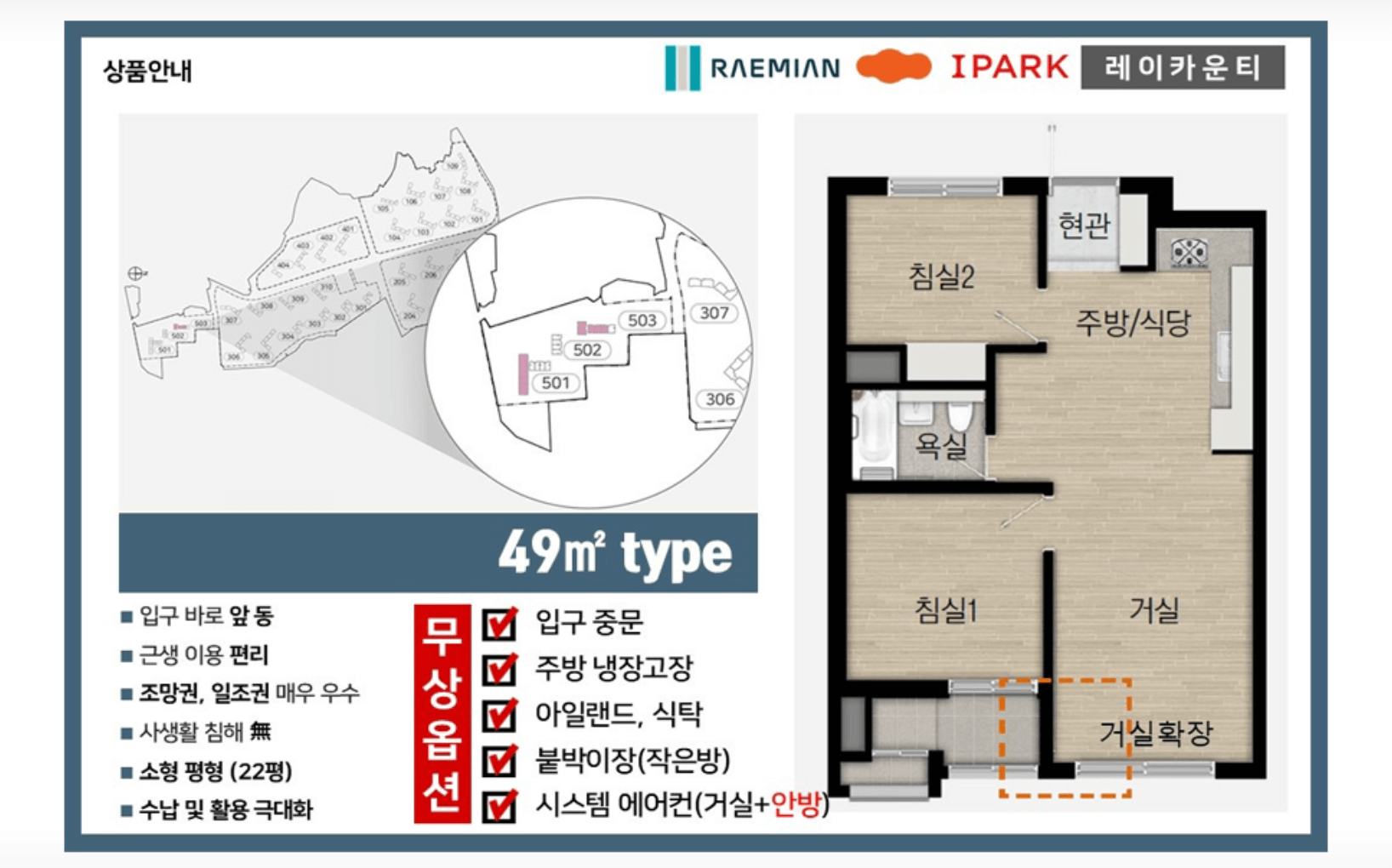 모든 세대에는 시스템에어컨, 붙박이장, 발코니장 등 기본 옵션이 무상 제공되어 인테리어 부담을 줄였습니다. 실속형 구조와 기본 옵션 덕분에 “작지만 알찬 집”이라는 평가를 받습니다.