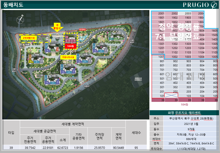 부산광역시 북구 산성로 28에 위치한 화명 푸르지오 헤리센트 아파트는 2021년 3월에 준공된 새 아파트입니다. 이 아파트는 총 886세대로 구성되어 있으며 9개 동으로 이루어져 있습니다. 각 동은 지하 3층에서 지상 12층에서 35층까지 다양한 층수로 구성되어 있으며 다양한 평형의 아파트를 제공합니다. 화명 푸르지오 헤리센트는 104동 전용면적 39㎡ 소형평수 선착순으로 분양 중에 있으며, 주차 시설 또한 넉넉하게 마련되어 있어 세대당 주차비율은 약 1.27대로 불편함 없이 주차할 수 있습니다.