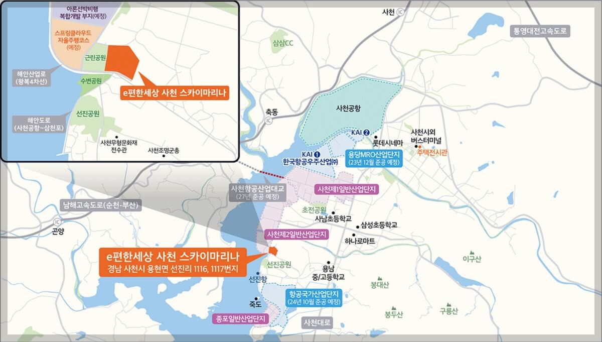 사천 스카이마리나 주변에는 항공국가산업단지와 용당 MPO산업단지가 22년 12월에 준공될 예정이며, 남해주공산업대교가 27년에 준공 예정입니다. 또한, 남측에는 약 7천여 평으로 조성되는 수변공원이 22년 12월에 준공되며, 서측에는 아론선박비행과 스프링클라우드 업체에서 신규 개발계획을 준비 중입니다.